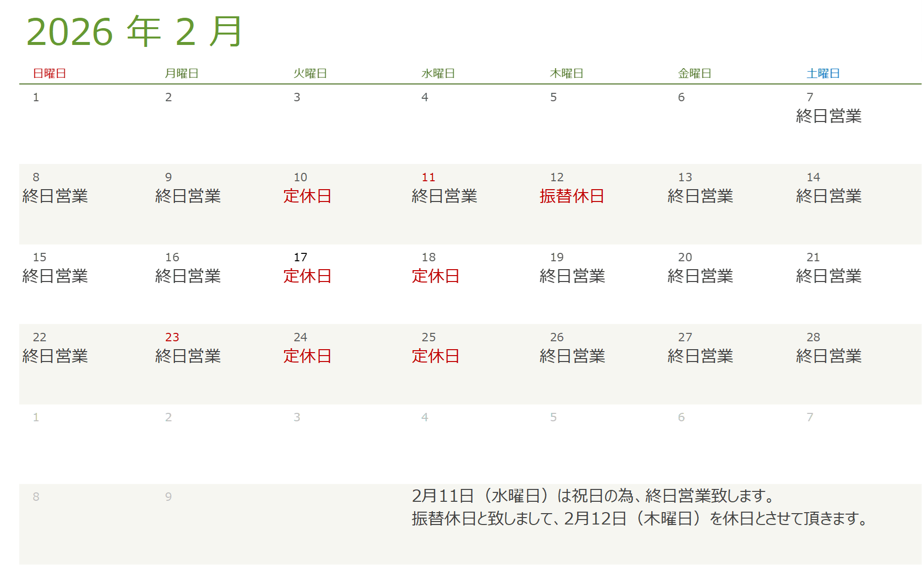 2026年2月の営業日でございます。
