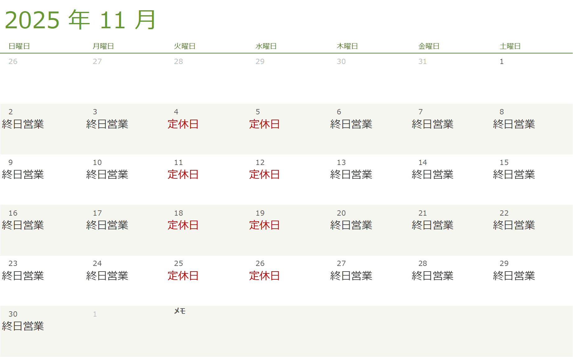 プリモフィト軽井沢駅舎店の2025年11月、営業日はカレンダーの通りとなります。